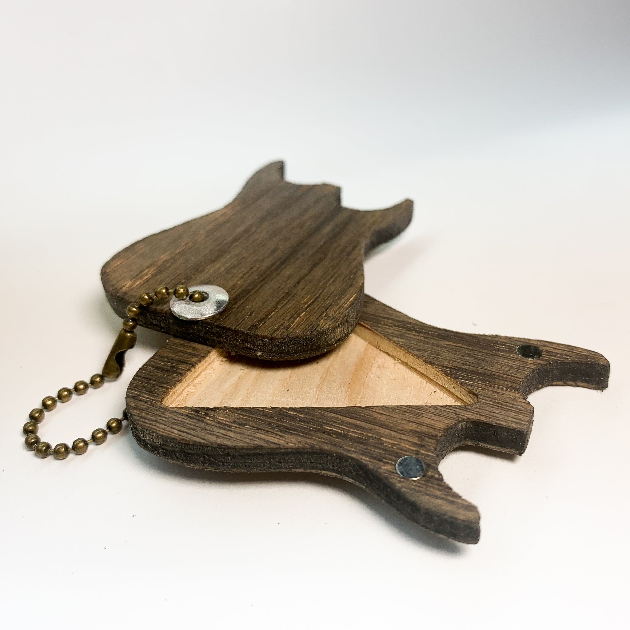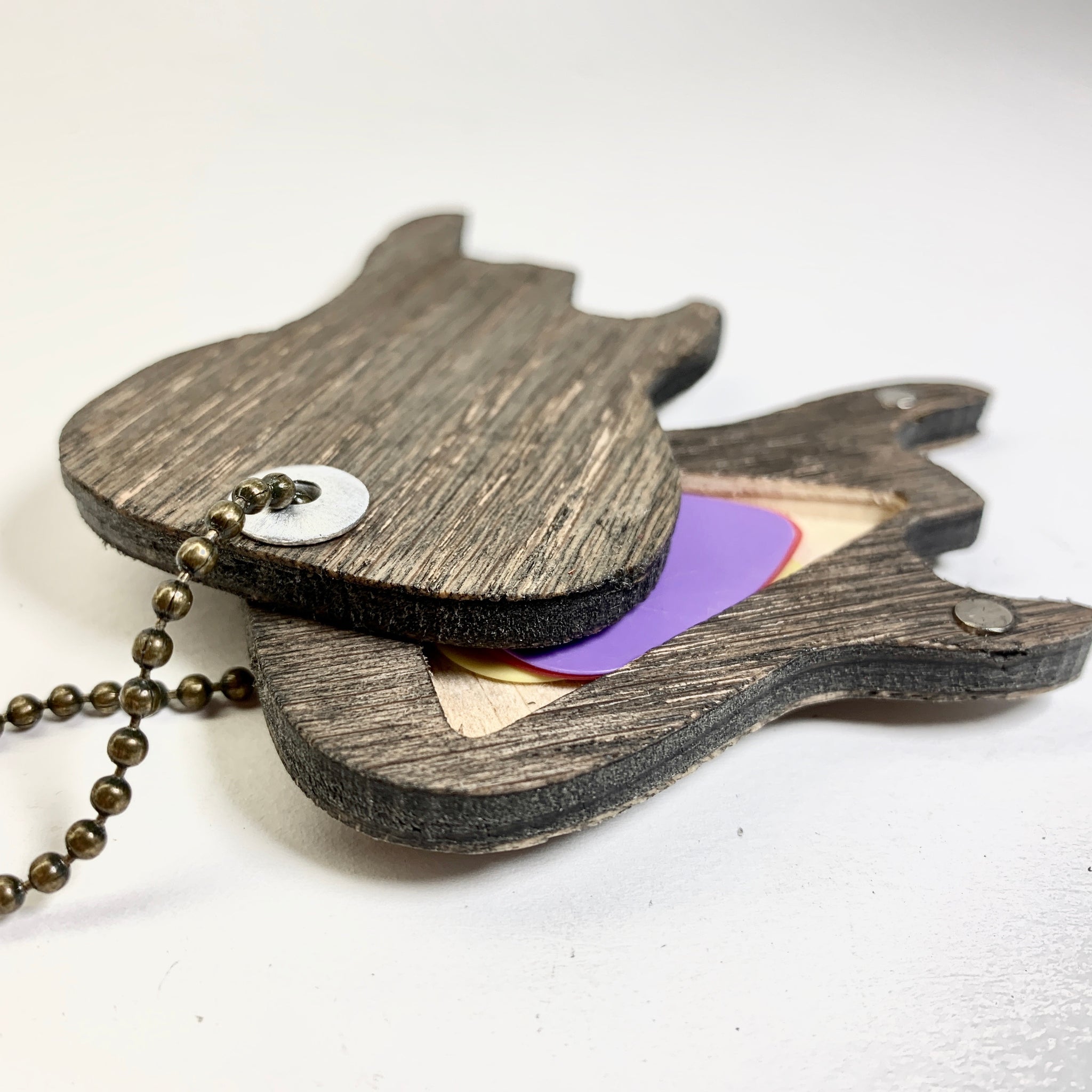 Let's be honest. Keeping track of picks is tough work. Once it leaves your fingertips we all know we might as well say goodbye! We have your solution right here. By way of BNB Customs we have an amazing marriage of style and functionality in the form of a keychain. Don't get it twisted though this is not just any ol' keychain. This hand crafted keychain that swivels open, unveiling a secret compartment for those highly treasured picks you always lose. No more of that, once you have this. They come in many different familiar electric, acoustic and bass guitar style designs.